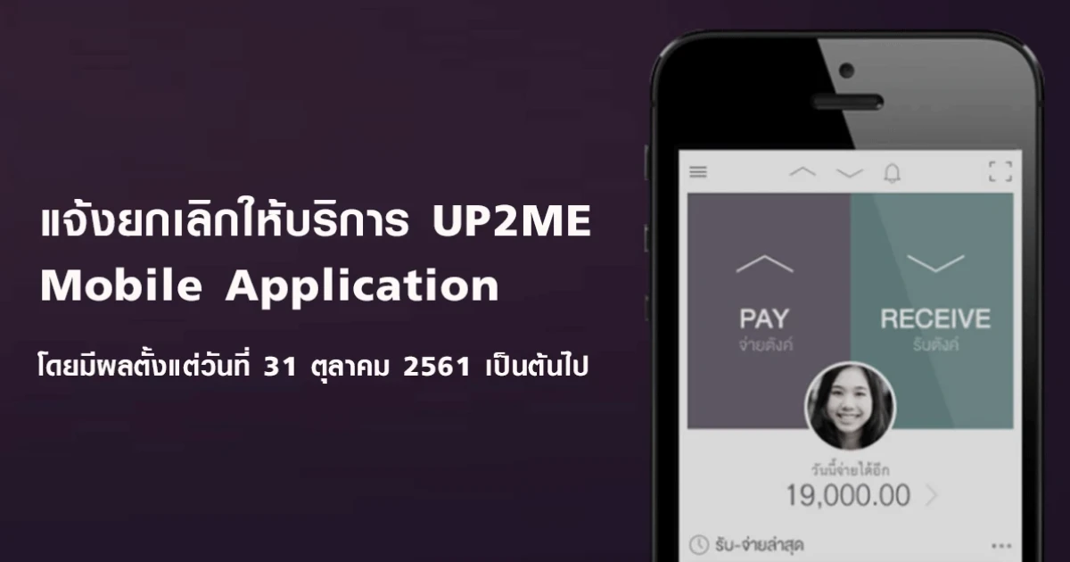 ธนาคารไทยพาณิชย์แจ้งยกเลิกให้บริการ UP2ME Mobile Application ตั้งแต่วันที่ 31 ต.ค. 61