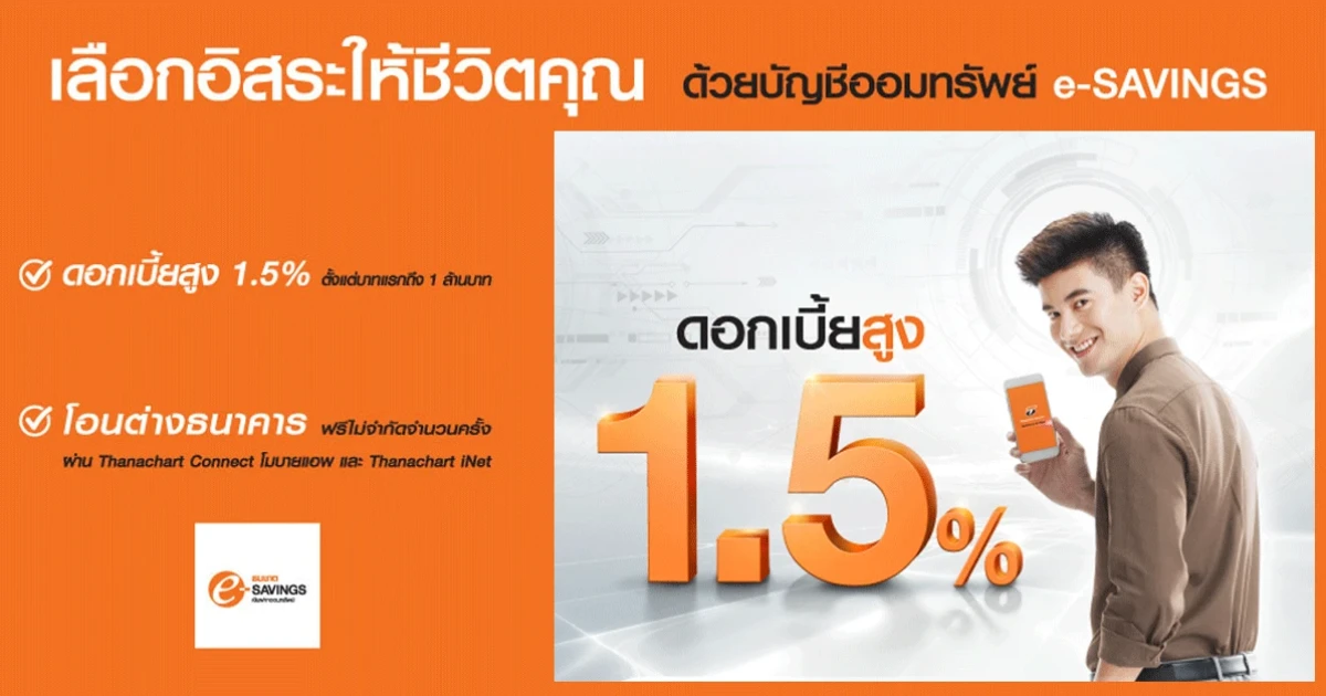 เลือกชีวิตอิสระได้ กับบัญชีเงินฝากออมทรัพย์ e-Savings จาก ธ.ธนชาต ให้ดอกเบี้ยสูงสุดถึง 1.5% ต่อปี