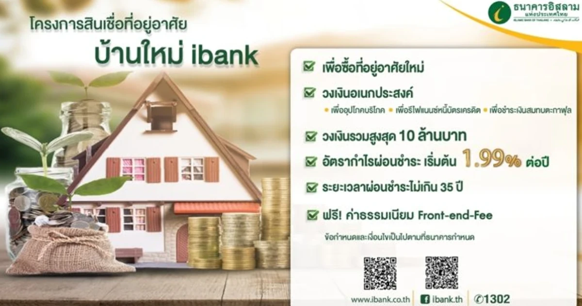 รายงานข่าวจากธนาคารอิสลามแห่งประเทศไทย (ไอแบงก์) เปิดเผยว่า ธนาคารได้ออกผลิตภัณฑ์สินเชื่อ "บ้านใหม่ ibank" ที่ลูกค้าสามารถขอสินเชื่อเพื่อซื้อบ้านใหม่และรีไฟแนนซ์บัตรเครดิตหรือสินเชื่อบุคคล จากสถาบันการเงินอื่นได้พร้อมกัน โดยคิดอัตรากำไรต่ำและผ่อนสบายๆ ได้นานถึง 35 ปี