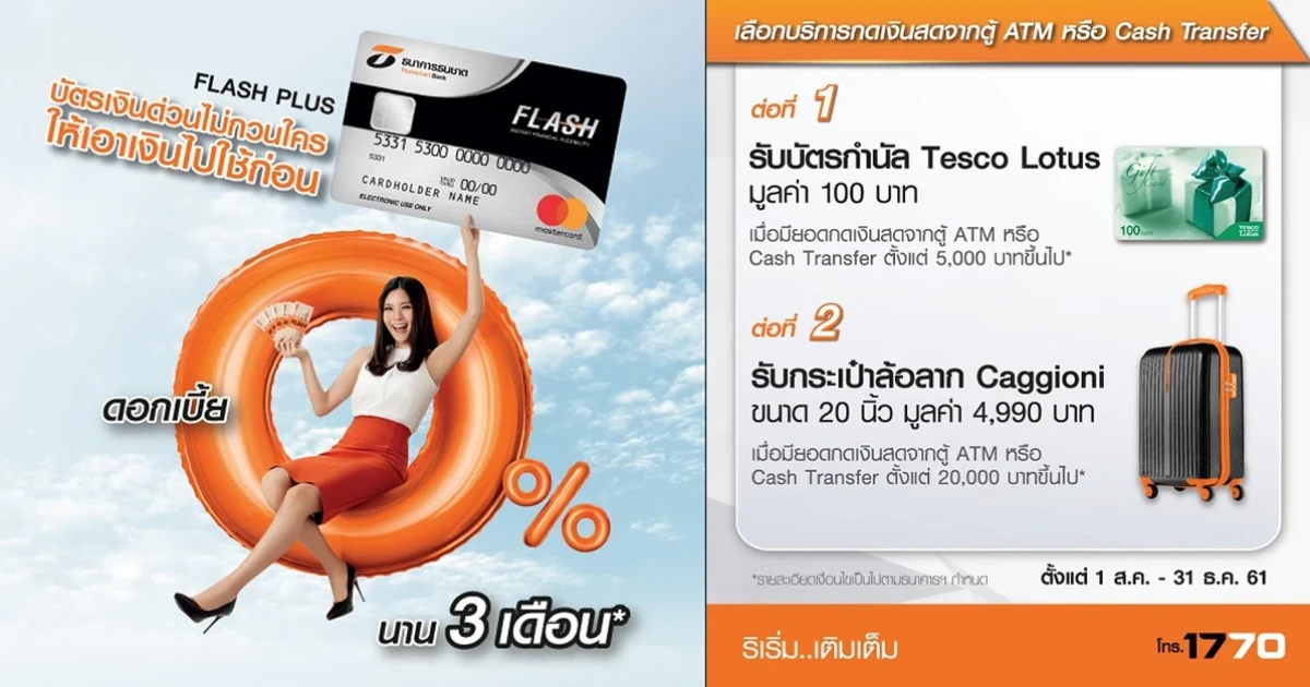 สิทธิพิเศษที่ลูกค้าจะได้รับตามรายการส่งเสริมการขายสินเชื่อบุคคลธนชาต FLASH Plus ตั้งแต่วันที่ 1 ส.ค.- ธ.ค. 61