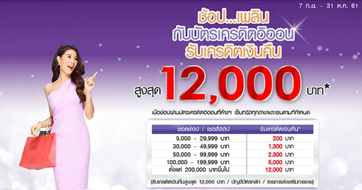 ช้อป.. เพลิน กับบัตรเครดิตอิออน รับเครดิตเงินคืนสูงสุด 12,000 บาท ณ ห้างสรรพสินค้าเซ็นทรัลทุกสาขา และห้างสรรพสินค้าเซน เมื่อมียอดช้อปตามจำนวนที่กำหนด
