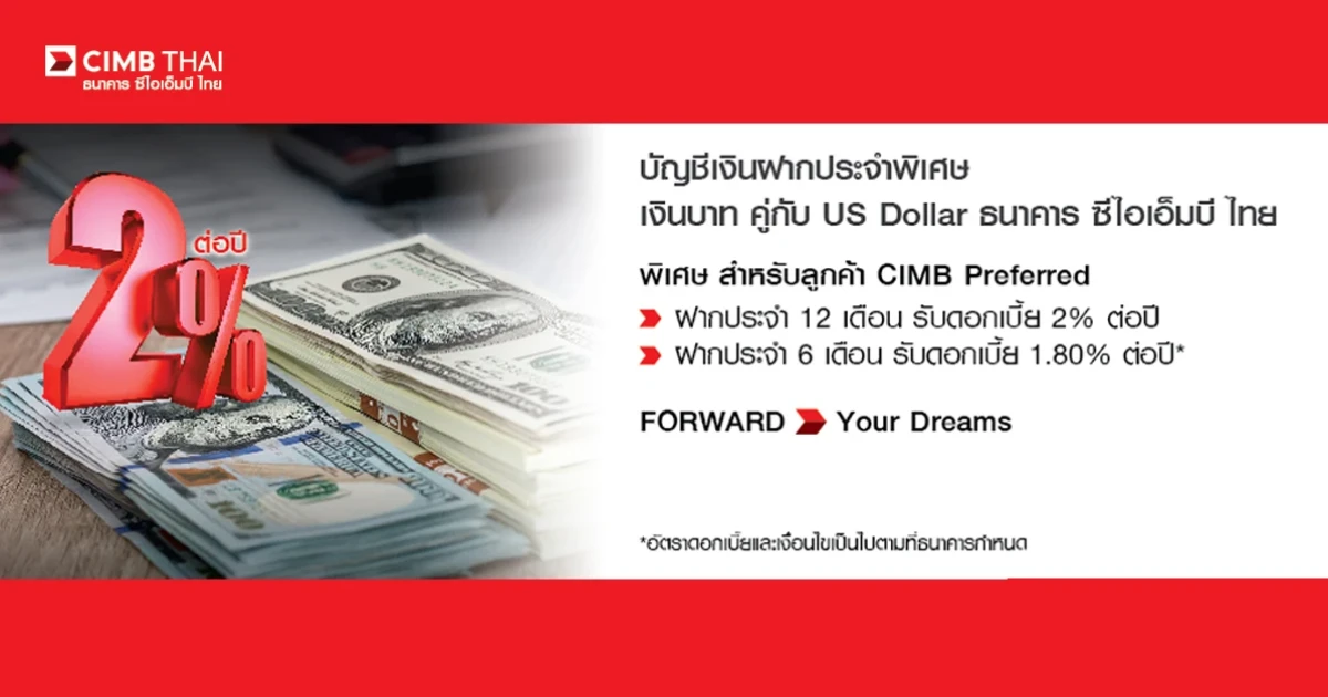 บัญชีเงินฝากประจำพิเศษเงินบาท คู่ US Dollar จาก CIMB ให้ดอกเบี้ยสูงสุด 2.00% ต่อปี*