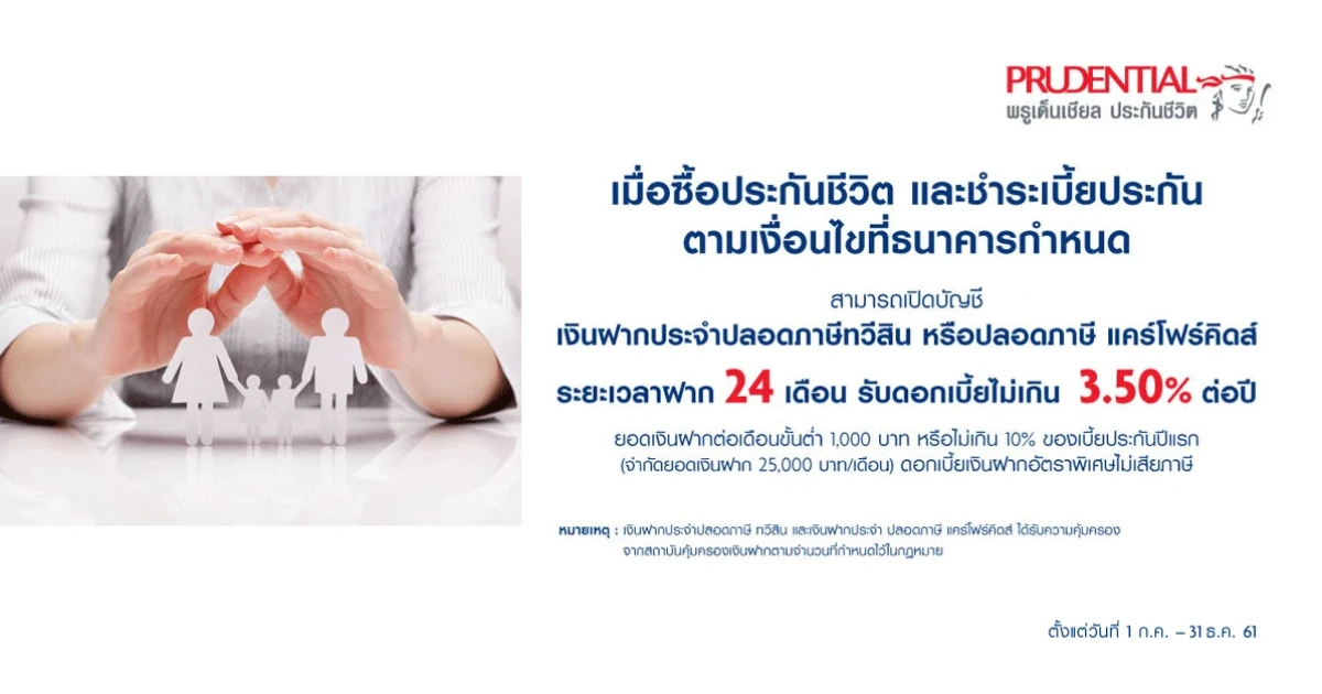 - ลูกค้าต้องซื้อประกันชีวิตและชำระเบี้ยประกันขั้นต่ำ 50,000 บาท ต่อปี ต่อกรมธรรม์ (ระยะเวลาการจ่ายเบี้ยประกันขึ้นอยู่กับประเภทของผลิตภัณฑ์ประกัน) รายชื่อประกันภัยที่เข้าร่วม 12 แบบ ได้แก่ PRUhappy savings 6/15, PRUmax savings 6/12, Prumax Wealth 6/12, PURdefind 8/A88, PRUdream guard20/20, PRUfamily guard 10/A90, PURincome guard 10/20, PRUgreat annuity 390 5/A85, PRUhappy annuity 390 A60/A85, PRUhappy life guard A60/A70, PRUguardian 7/20, PRUsecure living 8/A75 โดยลูกค้าต้องซื้อกรมธรรม์ ตั้งแต่ วันที่ 1 ก.ค. - 31 ธ.ค. 2561 เท่านั้น (กรมธรรม์ต้องได้รับการอนุมัติก่อนการเปิดบัญชีเงินฝาก และกรมธรรม์ต้องได้รับการอนุมัติไม่เกินวันที่ 10 ม.ค. 2562) และลูกค้าต้องเปิดบัญชีเงินฝากประจำปลอดภาษีทวีสินหรือเงินฝากประจำปลอดภาษีแครโฟร์คิดส์ ตั้งแต่วันที่ 1 ก.ค. 2561 - 31 ม.ค. 2562 ยอดเงินฝากขั้นต่ำ 1,000 บาทต่อเดือน หรือไม่เกิน 10% ของเบี้ยประกันปีแรก (จำกัดยอดเงินฝากไม่เกิน 25,000 บาทต่อเดือน) ระยะเวลาการฝาก 24 เดือน โดยจะมียอดเงินฝากรวมไม่เกิน 600,000 บาท ตามเกณฑ์ของกรมสรรพากร