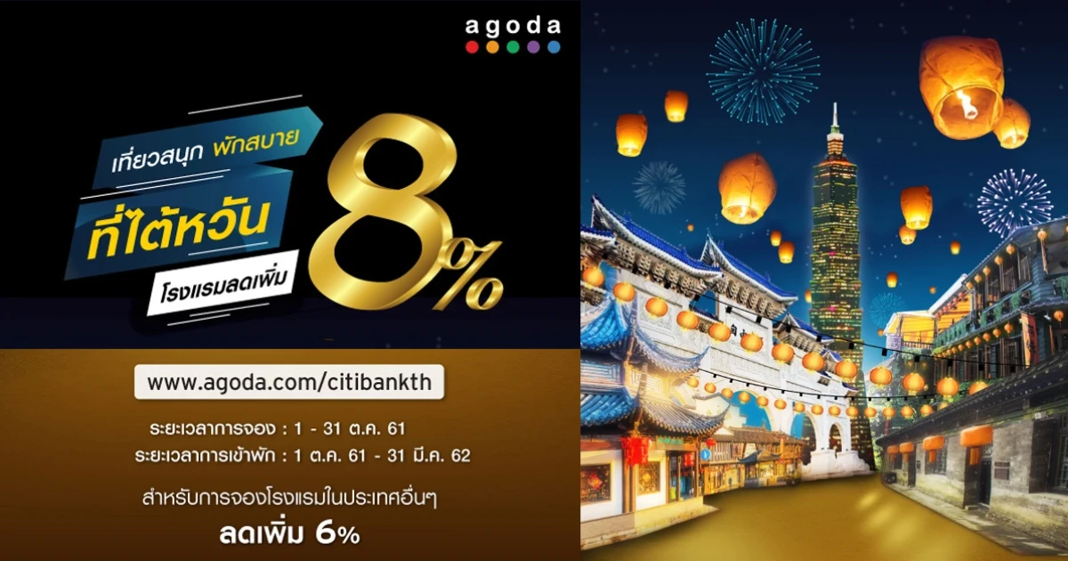 เที่ยวสนุก พักสบาย ที่ไต้หวัน รับส่วนลดเพิ่ม 8% เพียงจองโรงแรมที่ร่วมรายการผ่าน www.agoda.com/citibankth และชำระด้วยบัตรเครดิตซิตี้ (สำหรับการจองโรงแรมในประเทศอื่นๆ ลดเพิ่ม 6%)