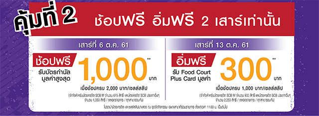 - สิทธิพิเศษสำหรับผู้ถือบัตรเครดิตไทยพาณิชย์ ("ผู้ถือบัตร") ทุกประเภท ยกเว้นบัตร SCB Family Plus เมื่อใช้จ่ายโดยแลกคะแนนสะสม M Point และคะแนนสะสม SCB Rewards เท่ายอดซื้อ ที่ห้างสรรพสินค้า เดอะมอลล์ ทุกสาขา, เอ็มโพเรียม, เอ็มควอเทียร์, พารากอน และบลูพอร์ต รวม เพาเวอร์มอลล์ กรูเมต์ มาร์เก๊ต และโฮม เฟรช มาร์ท ทุกสาขา ระหว่างวันที่ 5 - 14 ตุลาคม 2561