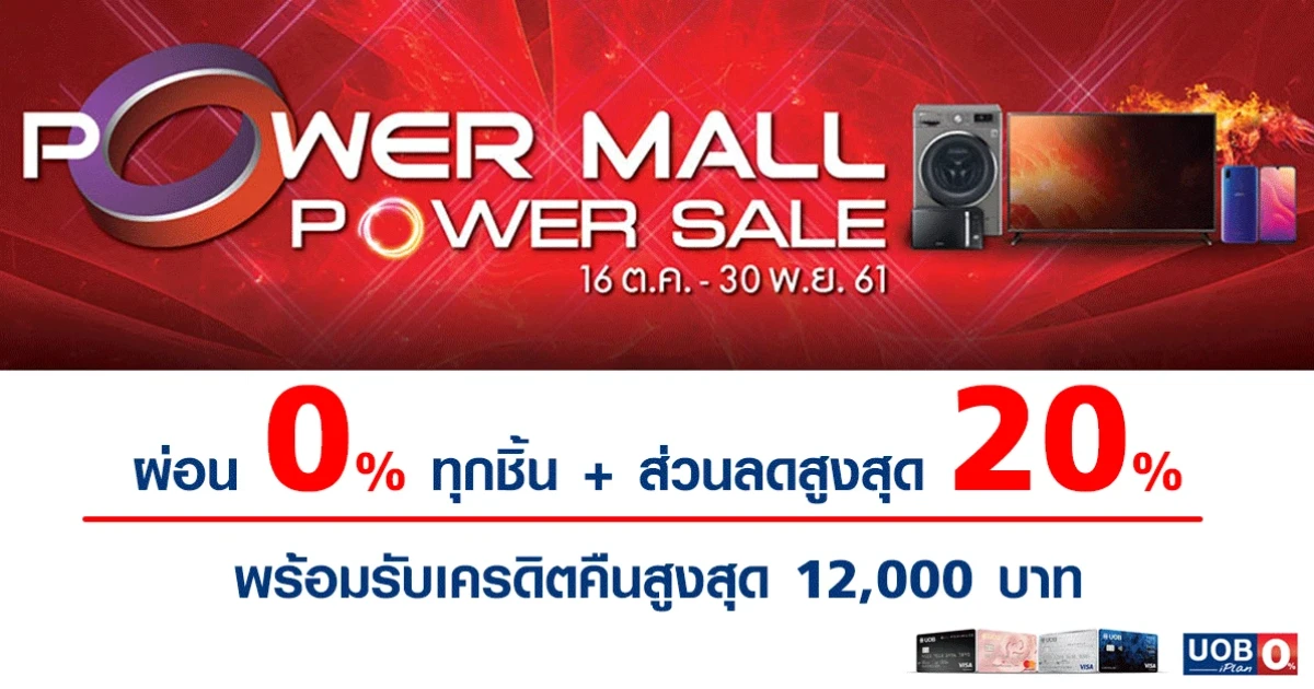 โปรโมชั่นสุดคุ้ม จากบัตรเครดิตยูโอบี ผ่อน 0% ทุกชิ้น + ส่วนลดสูงสุด 20% พร้อมรับเครดิตคืนสูงสุด 12,000 บาท ในงาน Power Mall Power Sale ที่แผนก POWER MALL เดอะมอลล์ ทุกสาขา, เอ็มโพเรียม, พารากอน, บลูพอร์ต และ CDC ราชพฤกษ์