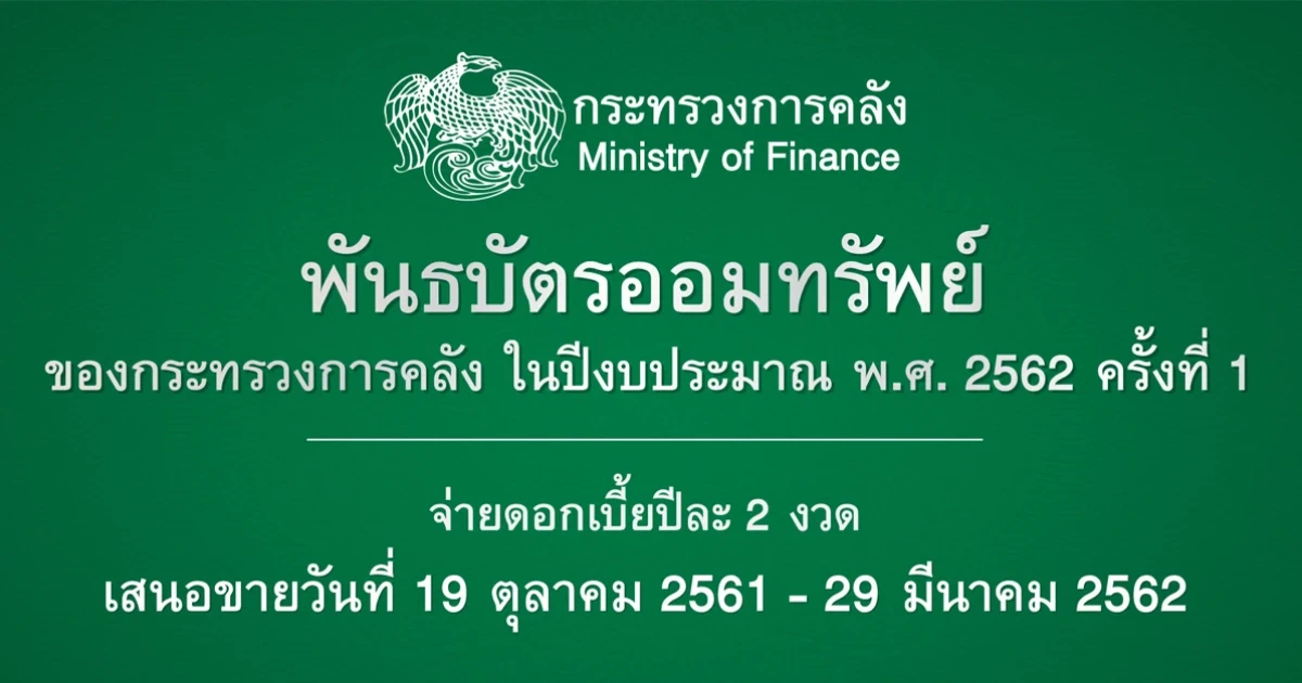 พันธบัตรออมทรัพย์ของกระทรวงการคลัง ในปีงบประมาณ พ.ศ. 2562 ครั้งที่ 1 เสนอขายหน่วยละ 1,000 บาท ขั้นต่ำ 1,000 บาท ไม่จำกัดวงเงินขั้นสูง จ่ายดอกเบี้ยปีละ 2 งวด ทุกวันที่ 19 พฤษภาคม และ 19 พฤศจิกายน ของทุกปี