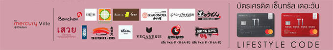 ส่วนลดสูงสุด 10% พร้อมรับเครดิตเงินคืนสูงสุด 600 บาท ที่ Mercury Ville ผ่านบัตรผ่านบัตรเครดิต เซ็นทรัล เดอะวัน ตั้งแต่วันนี้ - 31 ธันวาคม 2561 พร้อมสิทธิพิเศษ 2 ต่อ