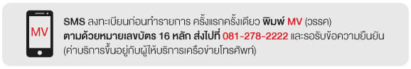 - สงวนสิทธิ์เฉพาะสมาชิกบัตรที่ลงทะเบียน SMS ถูกต้องก่อนทำรายการและได้รับข้อความยืนยันการลงทะเบียนสมบูรณ์แล้ว