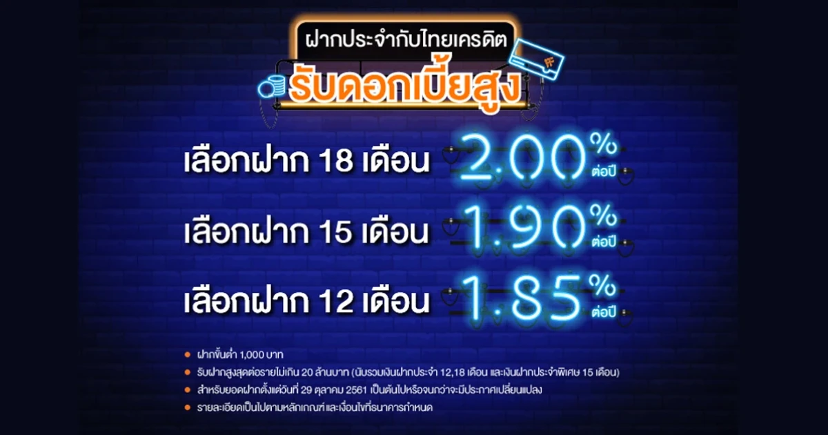 โปรโมชั่นบัญชีเงินฝากประจำดอกเบี้ยสูงจาก ธ.ไทยเครดิต ให้ดอกเบี้ยสูงสุด 2.00% ต่อปี