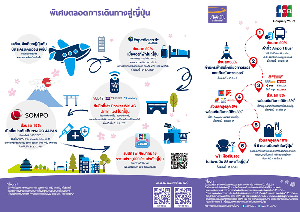 - รับสิทธิ์ลุ้นแพ็กเก็จเที่ยวญี่ปุ่นฟรี จำนวน 50 รางวัล ทุกปี โดย 1 รางวัล เดินทางได้ 2 ท่าน รวมมูลค่าต่อรางวัล 200,000 บาท ประกอบด้วย ตั๋วโดยสารชั้นประหยัด (ไป-กลับ) ที่พัก ภาษี ณ ที่จ่าย ฯลฯ