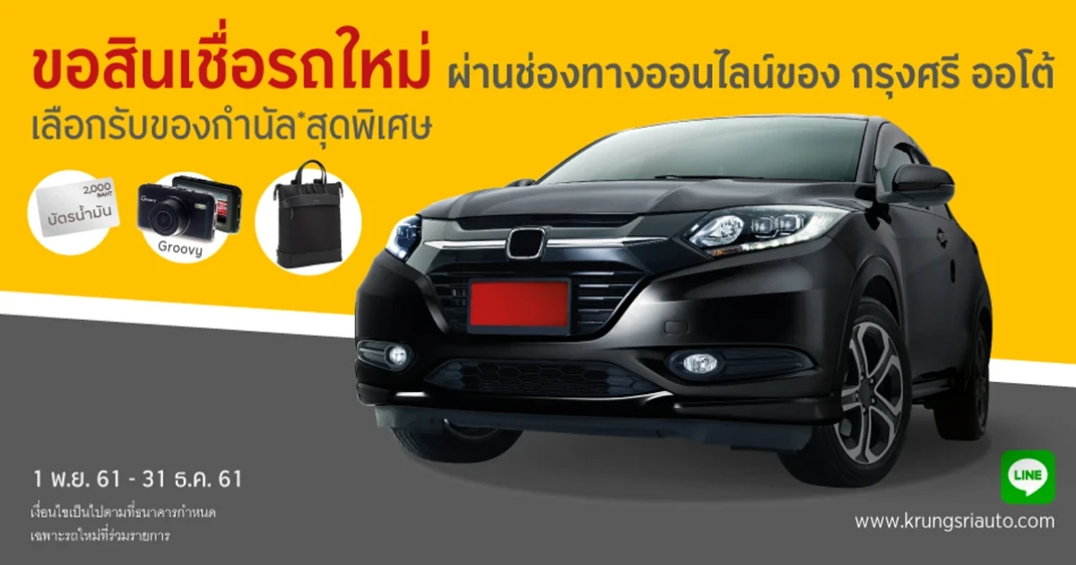 - ขอสงวนสิทธิ์ของกำนัล เฉพาะลูกค้าที่สมัครสินเชื่อ กรุงศรี นิว คาร์ ผ่าน Website, Line Official Account, Facebook ของ กรุงศรี ออโต้ ระหว่างวันที่ 1 พฤศจิกายน 2561 ถึง 31 ธันวาคม 2561 และได้รับการอนุมัติสินเชื่อเป็นเลขที่สัญญา และรับรถภายในวันที่ 31 มกราคม 2562