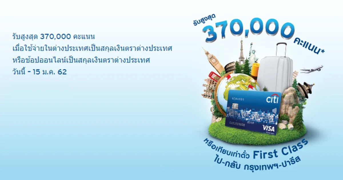 รับสูงสุด 370,000 คะแนน หรือเทียบเท่าตั๋ว First Class กรุงเทพฯ-ปารีส อภิสิทธิ์เฉพาะสมาชิกบัตรเครดิตซิตี้