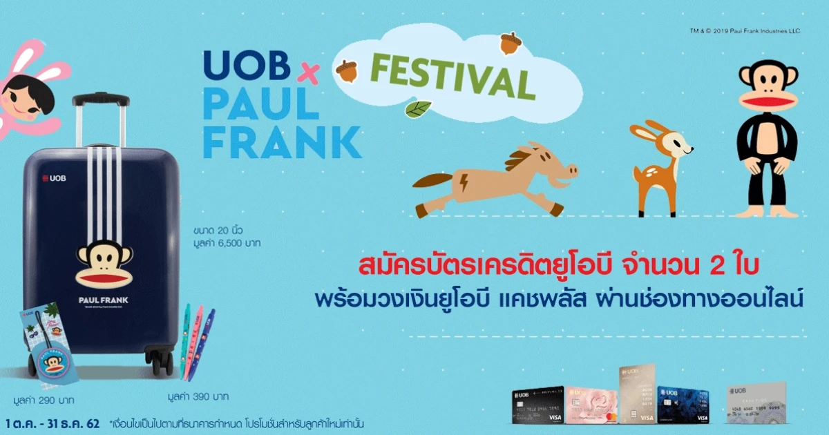 - ผู้ถือบัตรสามารถนำคะแนนสะสมพิเศษนี้ จำนวน 3,000 คะแนน มาแลกรับกระเป๋าเดินทาง Paul Frank ขนาด 20 นิ้ว มูลค่า 6,500 บาท ปากกา Paul Frank มูลค่า 390 บาท และ Bag Tag Paul Frank มูลค่า 290 บาท ภายใน 60 วัน นับจากวันที่ท่านได้รับ email ยืนยันการมอบคะแนนสะสมจากธนาคาร หรือท่านสามารถเลือกสะสมคะแนนต่อเพื่อแลกรับของกำนัลในแคตตาล็อก UOB Reward Plus จนกว่าคะแนนจะหมดอายุ