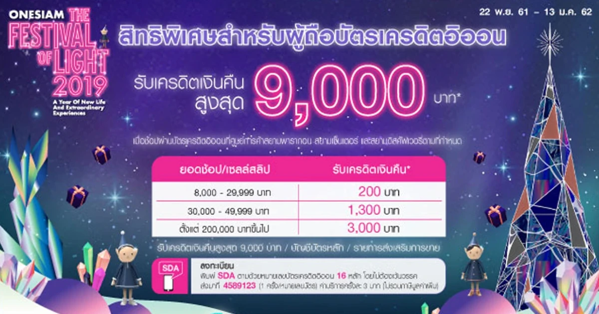 ลงทะเบียนร่วมรายการ ทาง SMS พิมพ์ SDA ตามด้วยหมายเลขบัตรเครดิต 16 หลัก ส่งมาที่ 4589123 ภายในระยะเวลาส่งเสริมการขาย และได้รับข้อความตอบรับจากระบบ (1 ครั้ง / บัตร / รายการส่งเสริมการขาย)