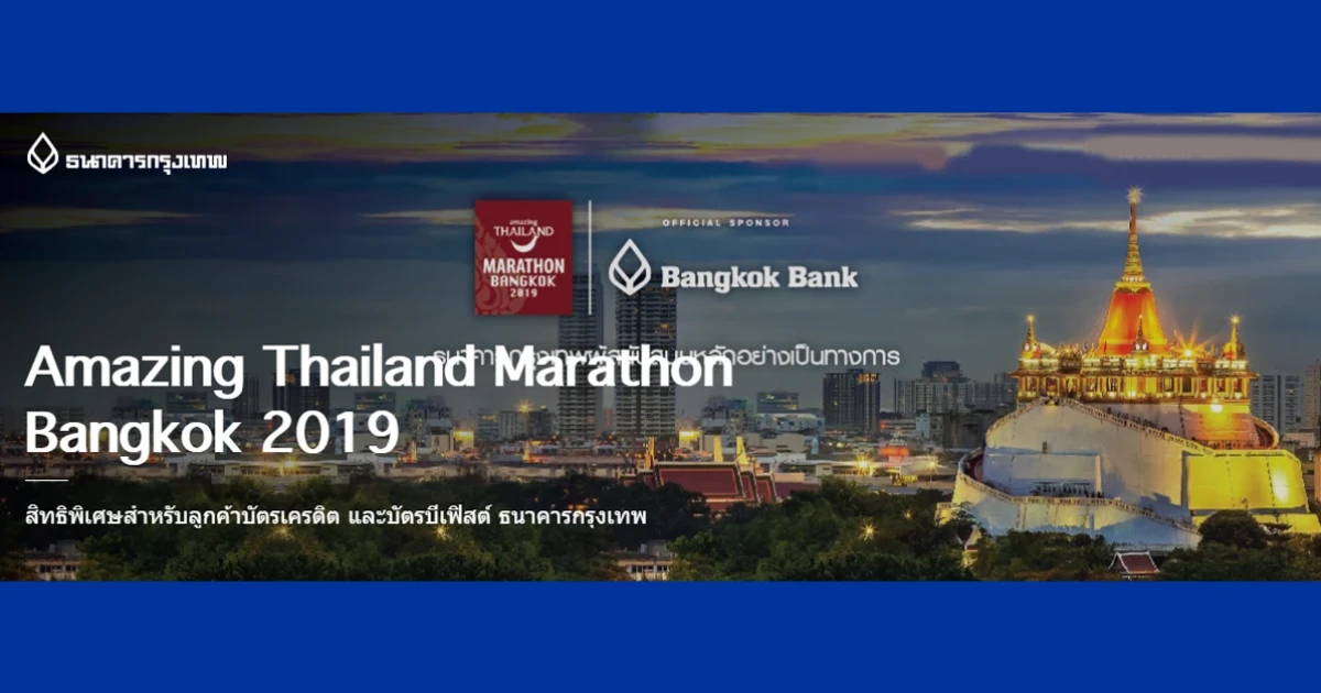 - รับส่วนลด 15% เมื่อลงทะเบียนร่วมแข่งขันทาง www.amazingthailandmarathon2019.com และใช้โค้ดส่วนลดตามที่ระบุในเว็บไซต์ พร้อมชำระเงินด้วยบัตรธนาคารกรุงเทพ