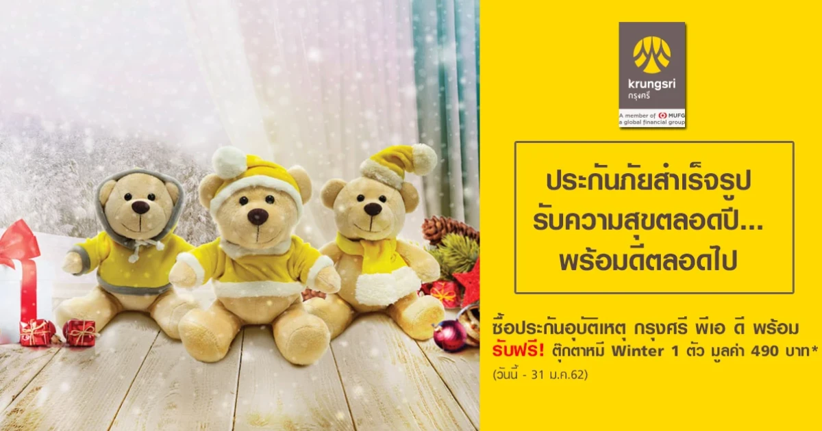 ซื้อประกันอุบัติเหตุ กรุงศรี พีเอ ดี พร้อม วันนี้ รับฟรี! ตุ๊กตาหมี Winter 1 ตัว มูลค่า 490 บาท