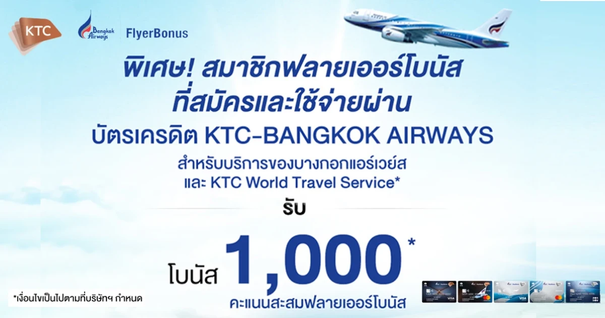 - ลูกค้าใหม่ที่สมัครบัตรเครดิต KTC-BANGKOK AIRWAYS โดยมียอดใช้จ่ายบนบัตรครั้งแรกที่สายการบินบางกอกแอร์เวย์ส หรือ KTC World Travel Service เพื่อชำระค่าสินค้าและบริการของสายการบินบางกอกแอร์เวย์ส ภายใน 90 วัน (หลังจากการอนุมัติบัตร) ผ่านบัตรเครดิต KTC-BANGKOK AIRWAYS รับคะแนนสะสมฟลายเออร์โบนัส 1,000 คะแนน
