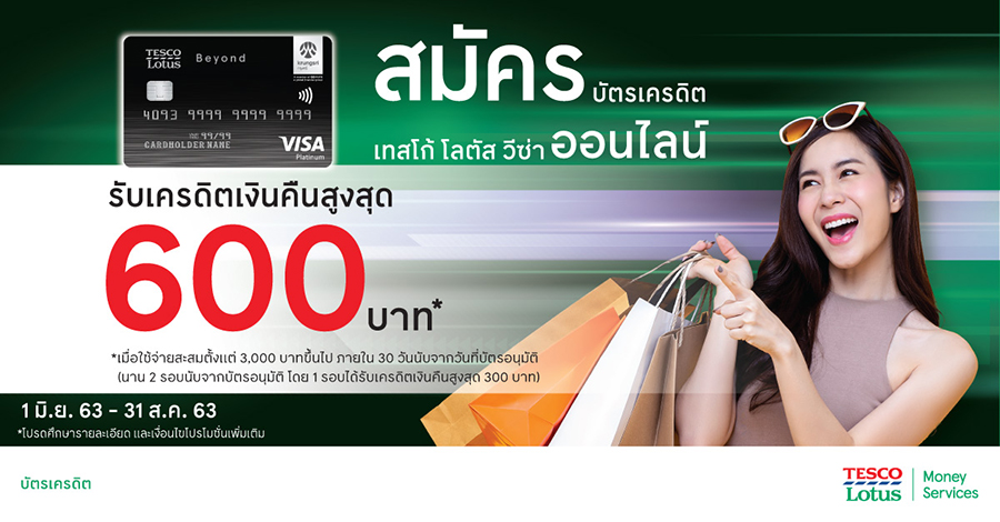 สมัครบัตรเครดิตเทสโก้ โลตัส วีซ่า ผ่านช่องทางออนไลน์วันนี้!! รับเครดิตเงินคืนสูงสุด 600 บาท*