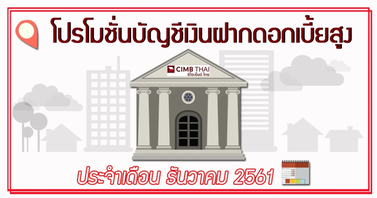 โปรโมชั่นบัญชีเงินฝากดอกเบี้ยสูงประจำเดือนธันวาคม 2561 จากธนาคารซีไอเอ็มบี ไทย บัญชีเงินฝากประจำแบบมีกำหนดระยะเวลาที่ให้ดอกเบี้ยสูง และสามารถเลือกรับดอกเบี้ยแบบรายเดือน หรือเมื่อครบกำหนดได้