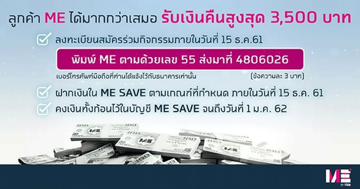 ลูกค้า ME ได้มากกว่าเสมอ กับโปรโมชั่นพิเศษ! ฝากเงินเพิ่ม "รับเงินคืนสูงสุด 3,500 บาท" เพียงลูกค้าคงยอดเงินฝากใน บัญชี ME SAVE ณ วันที่ 30 พ.ย. 61 และฝากเงินเพิ่มขึ้นตามเกณฑ์ที่กำหนดภายใน 15 ธ.ค. 61 พร้อมคงเงินทั้งก้อนไว้จนถึง 1 ม.ค. 62 โดยมีรายละเอียด ดังนี้
