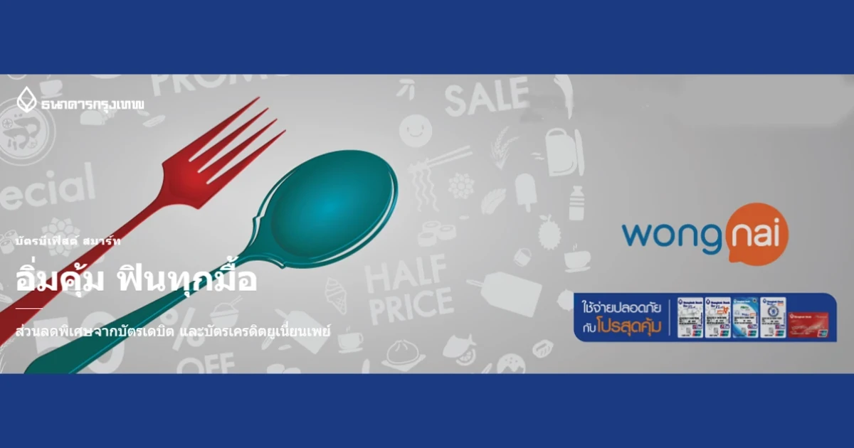อิ่มคุ้ม ฟินทุกมื้อ รับส่วนลดสูงสุด 30% เมื่อชำระเงินผ่านบัตรบีเฟิสต์ สมาร์ท ทีพีเอ็น ยูเนี่ยนเพย์ หรือบัตรเครดิตยูเนี่ยนเพย์ ธนาคารกรุงเทพ ที่ 25 ร้านค้า โดย Wongnai ตั้งแต่ 15 พ.ย. 61 - 31 มี.ค. 62