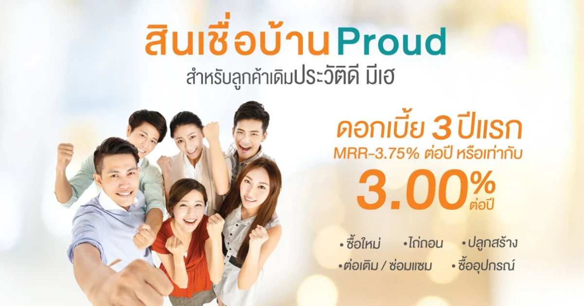 สินเชื่อบ้าน Proud สำหรับลูกค้าเดิมประวัติดี มีเฮ ดอกเบี้ย 3 ปีแรก MRR-3.75% ต่อปี หรือเท่ากับ 3.00% ต่อปี