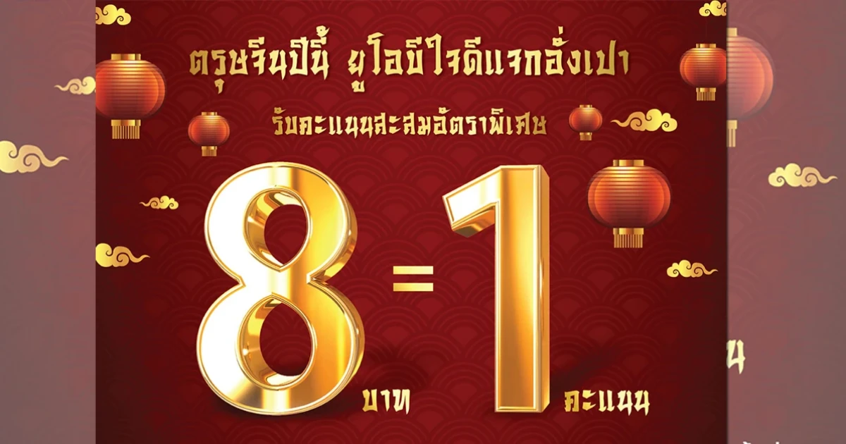 ตรุษจีนปีนี้ ยูโอบีใจดีแจกอั่งเปา สำหรับลูกค้าผู้ถือ บัตรเครดิตยูโอบี รับคะแนนสะสมอัตราพิเศษ 8 บาท = 1 คะแนน โดยไม่มีเงื่อนไขยอดใช้จ่ายขั้นต่ำ (จำกัดยอดใช้จ่ายไม่เกิน 10,000 บาท/ท่าน/ตลอดรายการ)