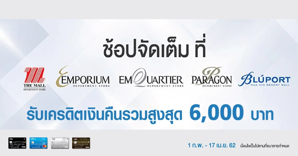 ช้อปจัดเต็ม!! กับบัตรเครดิตทีเอ็มบี เมื่อช้อปที่ห้างสรรพสินค้า เดอะมอลล์ทุกสาขา, เอ็มโพเรียม, เอ็มควอเทียร์, พารากอน และบลูพอร์ต รับเครดิตเงินคืนรวมสูงสุด 6,000 บาท