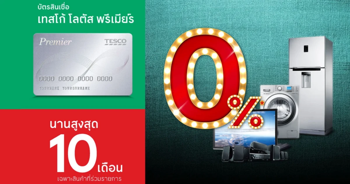 - บัตรสินเชื่อเทสโก้ โลตัส พรีเมียร์ ผ่อนชำระเครื่องใช้ไฟฟ้าอัตราดอกเบี้ย 0% นานสูงสุด 10 เดือน เฉพาะสินค้าที่ร่วมรายการ