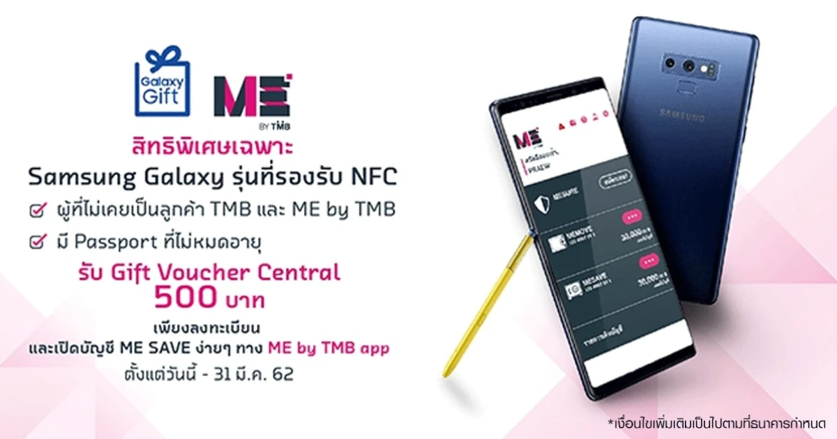 โปรโมชั่นพิเศษสำหรับเจ้าของ Samsung Galaxy 5,000 คนแรก ที่ยังไม่เคยเป็นลูกค้า ME หรือ TMB รับฟรี! Central Gift Voucher 500 บาท เพียงลงทะเบียนรับสิทธิ์ผ่านทาง Samsung Galaxy Gift และเปิด บัญชี ME SAVE ง่ายๆ ผ่าน ME by TMB App แบบไม่ต้องไปสาขา (เฉพาะโทรศัพท์รุ่นที่รองรับฟังก์ชัน NFC เท่านั้น)