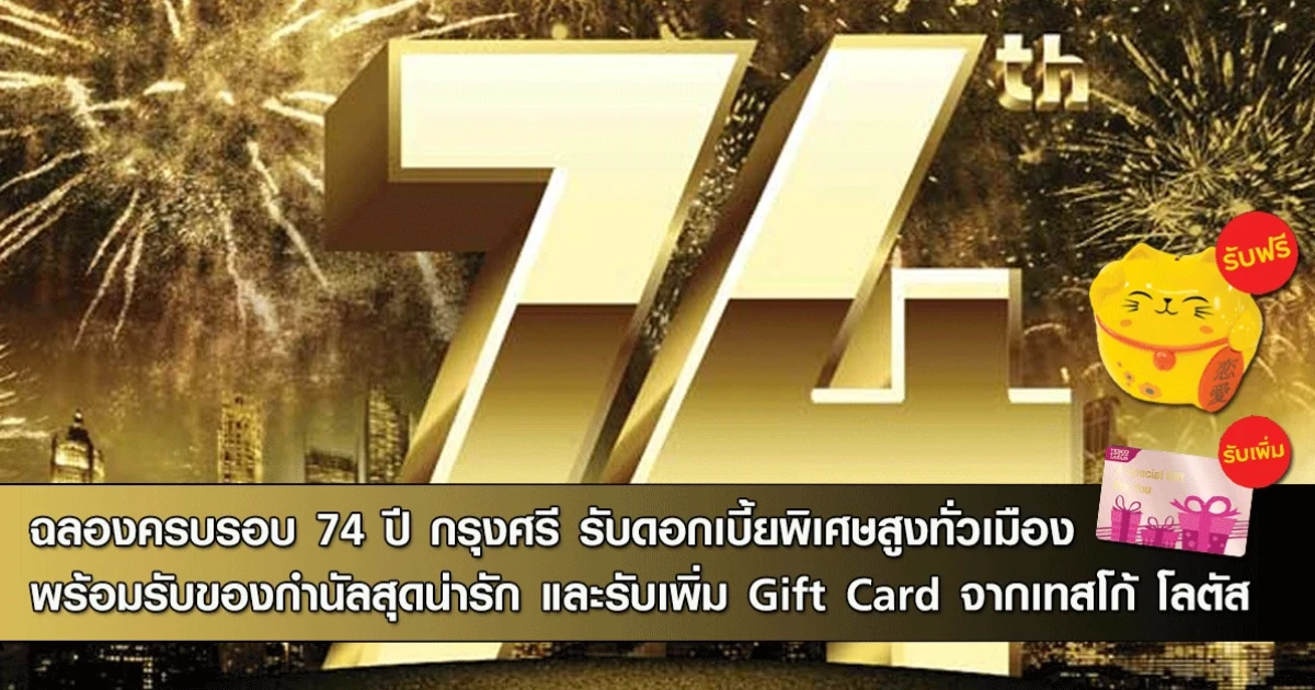ฉลองครบรอบ 74 ปี กรุงศรีฯ รับดอกเบี้ยพิเศษสูงทั่วเมือง พร้อมรับของกำนัลสุดน่ารัก และรับเพิ่ม Gift Card