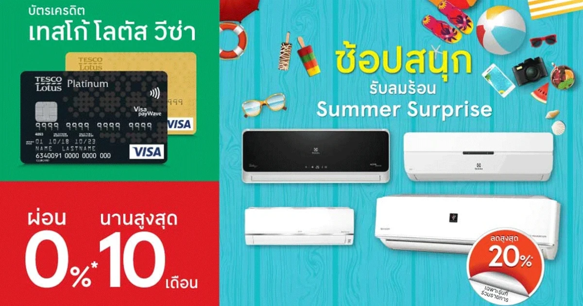 Summer Surprise กับ บัตรเครดิตเทสโก้ โลตัส วีซ่า ให้คุณผ่อนแอร์ ที่เทสโก้ โลตัส 0% นานสูงสุด 10 เดือน + รับเครดิตเงินคืนสูงสุด 20,000 บาท/หมายเลขบัญชีบัตรหลัก ตลอดรายการ