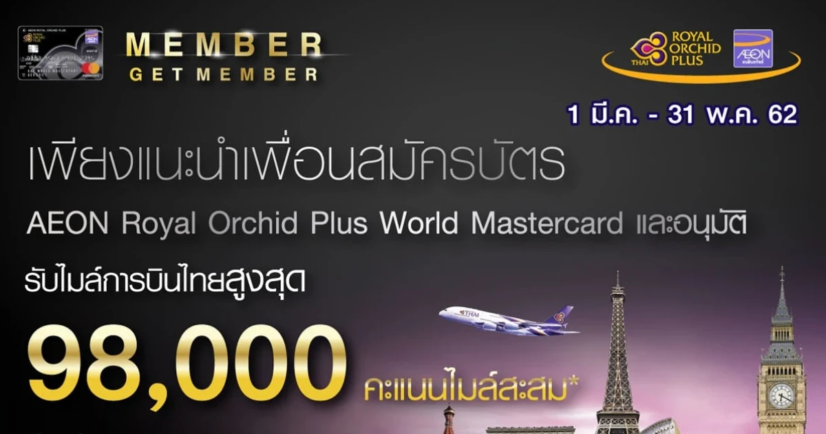 ไปยุโรปได้ง่ายๆ กับ Member Get Member Campaign เพียงชวนเพื่อนสมัคร AEON ROP World Mastercard และได้รับการอนุมัติ รับไมล์การบินไทยสูงสุด 98,000 คะแนนไมล์สะสม เทียบเท่าบัตรโดยสารการบินไทยตามเส้นทางที่กำหนด พร้อมตรวจสอบเพื่อนที่ชวนและอนุมัติที่ AEON Member Service