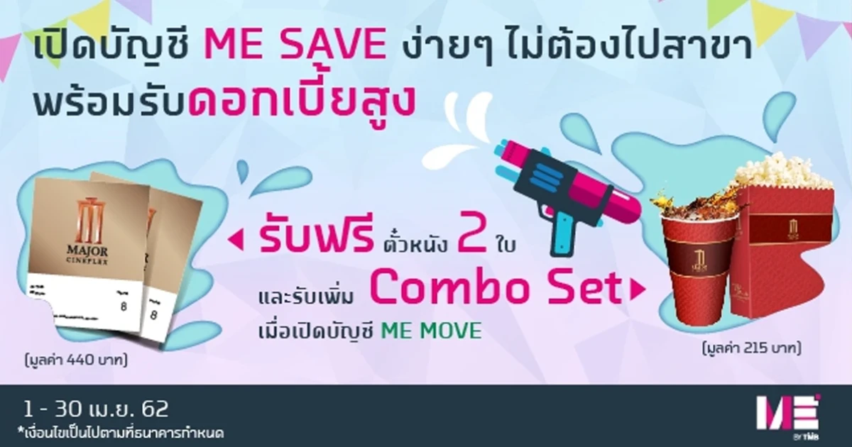 - ธนาคารจะจัดส่ง SMS E-Coupon สำหรับแลกรับตั๋วหนังจำนวน 2 ใบ มูลค่า 440 บาท และ E-Coupon สำหรับแลกรับ Combo Set มูลค่า 215 บาท ไปยังเบอร์โทรศัพท์มือถือที่ให้ไว้กับ ME เท่านั้น โดยลูกค้าจะต้องมีบัญชี ME SAVE และ ME MOVE อยู่กับธนาคารจนถึงวันที่ทำการจัดส่ง SMS E-Coupon (ภายใน 30 วัน หลังจากที่ลูกค้าเปิดบัญชีเสร็จสมบูรณ์)