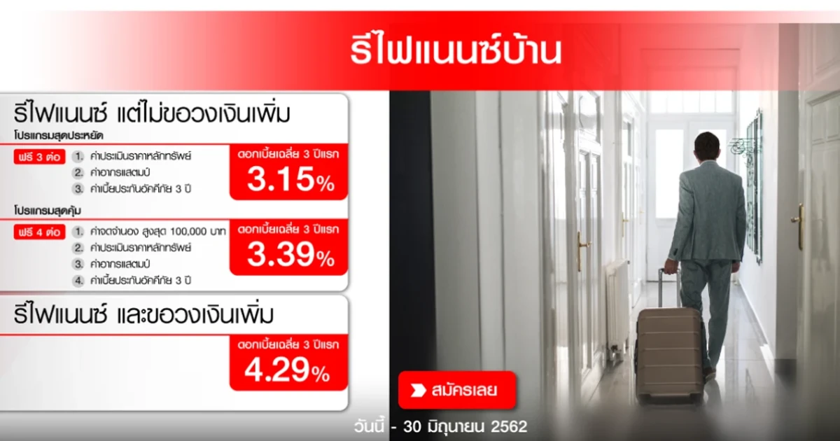 รีไฟแนนซ์บ้าน ดอกเบี้ยสุดประหยัดเฉลี่ย 3 ปีแรก 3.15% ต่อปี จาก ธนาคาร ซีไอเอ็มบี ไทย ถึง 30 มิ.ย. 62