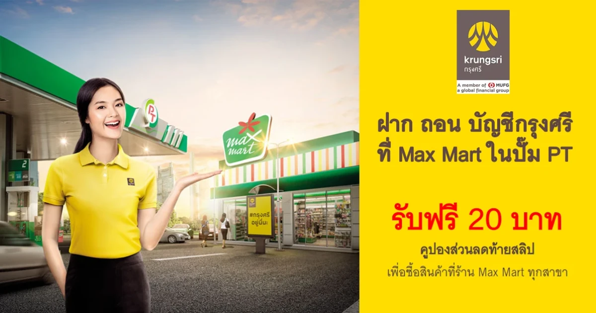 ฝาก ถอน บัญชีกรุงศรี ที่ Max Mart ในปั๊ม PT รับฟรีคูปองส่วนลดท้ายสลิป 20 บาท
