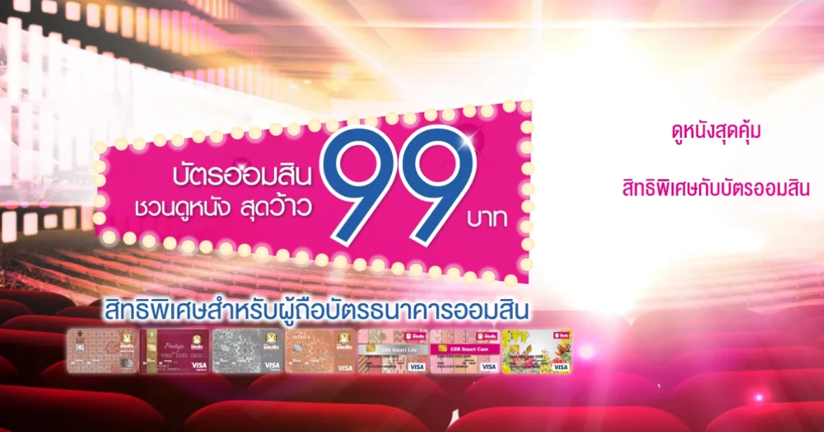 - สิทธิพิเศษสำหรับลูกค้าบัตรอิเล็กทรอนิกส์ธนาคารออมสิน ซื้อบัตรชมภาพยนตร์ 1 ที่นั่ง ในราคา 99 บาท สำหรับที่นั่งปกติ (Normal Seat) โดยต้องชำระค่าบัตรชมภาพยนตร์ผ่านบัตรอิเล็กทรอนิกส์ธนาคารออมสินเท่านั้น โดยใช้งานผ่าน Box office เท่านั้น