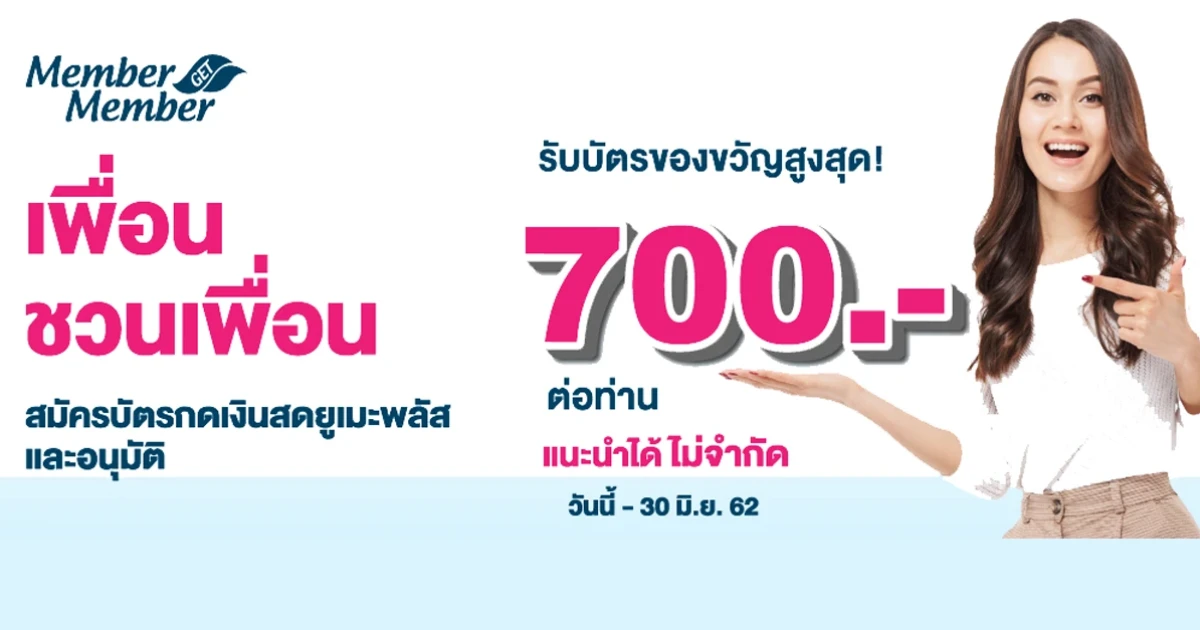 เพื่อนชวนเพื่อน สมัครบัตรกดเงินสดยูเมะพลัส และอนุมัติ รับบัตรของขวัญสูงสุด 700 บาท