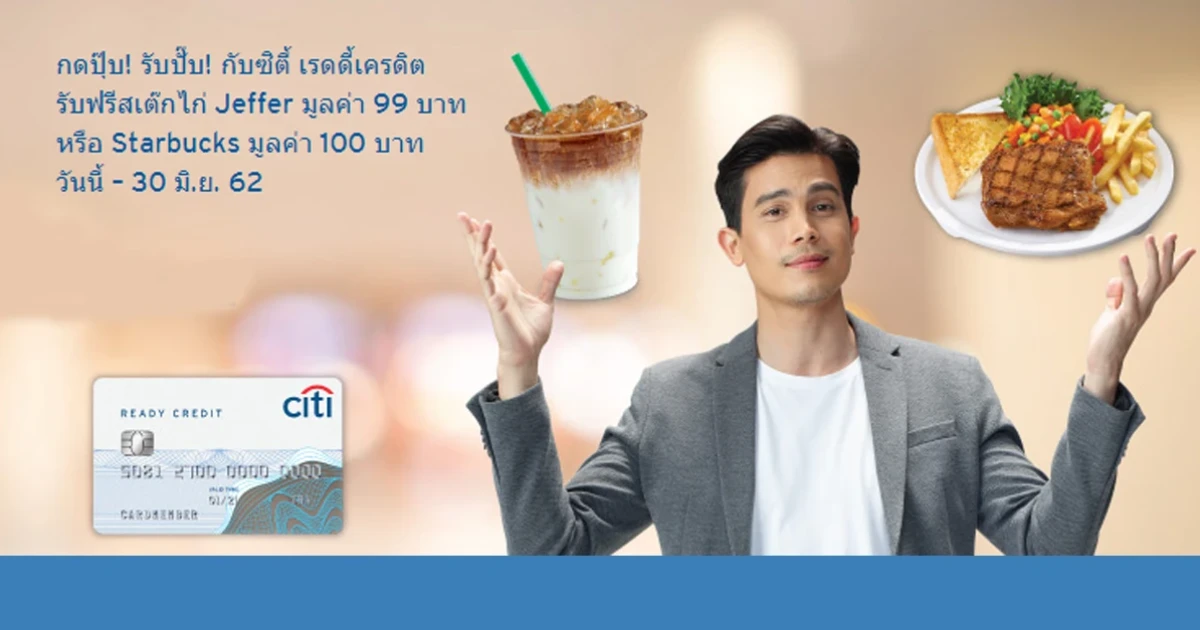 - สมาชิกบัญชีซิตี้ เรดดี้เครดิต รับฟรี Jeffer Spicy Chicken (สเต๊กไก่เจฟเฟอร์) 1 จาน มูลค่า 99 บาท ที่ร้าน Jeffer หรือ E-Coupon มูลค่า 100 บาท ที่ร้าน Starbucks