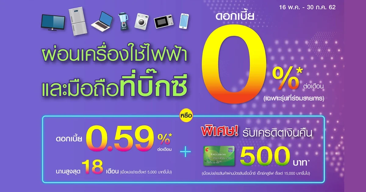 ผ่อนเครื่องใช้ไฟฟ้า หรือโทรศัพท์มือถือ ดอกเบี้ย 0% หรือ 0.59% นานสูงสุด 18 เดือน ที่บิ๊กซี