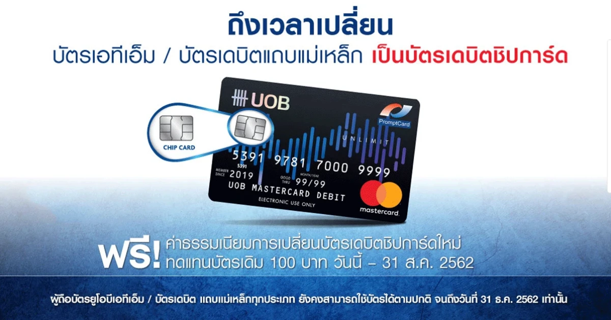 ฟรี! ค่าธรรมเนียม เปลี่ยนบัตรยูโอบีเอทีเอ็ม/บัตรเดบิต แถบแม่เหล็กทุกประเภท เป็นบัตรเดบิตชิปการ์ด