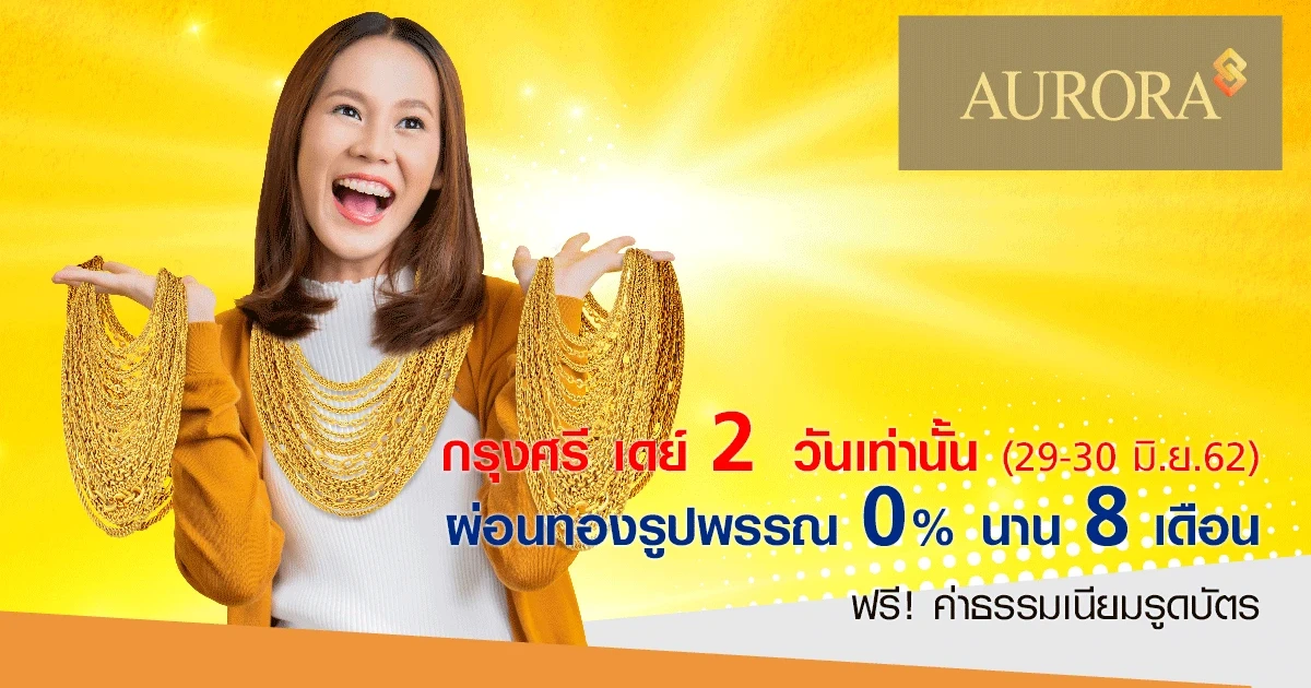 กรุงศรี เดย์ 2 วันเท่านั้น!! ผ่อนทองรูปพรรณ 0% นาน 8 เดือน ฟรี! ค่าธรรมเนียมรูดบัตร หรือเลือกผ่อนด้วยอัตราดอกเบี้ยพิเศษสบายๆ นานสูงสุด 10 เดือน ที่ห้างเพชรทองออโรร่าทุกสาขา