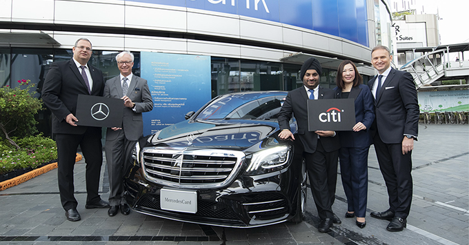 บริษัท เมอร์เซเดส-เบนซ์ (ประเทศไทย) จำกัด นำโดย มร.โรลันด์ โฟลเกอร์ (ที่ 2 จากซ้าย) ประธานบริหาร และ มร.ไฮโกะ นิทส์เช่ (ซ้ายสุด) รองประธานบริหารฝ่ายการเงิน ประกาศความร่วมมือครั้งยิ่งใหญ่กับซิตี้แบงก์ ประเทศไทย นำโดย มร.ทีบอร์ พานดิ (ขวาสุด) กรรมการผู้จัดการใหญ่ คุณวีระอนงค์ จิระนคร ภู่ตระกูล (ที่ 2 จากขวา) รองกรรมการผู้จัดการใหญ่ สายงานบุคคลธนกิจ และ มร.ซานดีพ บาตระ (ที่ 3 จากขวา) ผู้ช่วยกรรมการผู้จัดการใหญ่ ฝ่ายธุรกิจบัตรเครดิตและสินเชื่อบุคคล เปิดตัวผลิตภัณฑ์ทางการเงินใหม่ล่าสุดอย่างบัตรเครดิต "ซิตี้ เมอร์เซเดส" ครั้งแรกในประเทศไทยภายใต้แนวคิด "ความเหนือระดับที่พร้อมไปกับคุณทุกที่" ที่พร้อมมอบสิทธิประโยชน์สุดพิเศษระดับเวิลด์คลาส และไลฟ์สไตล์เหนือระดับให้แก่สมาชิก บัตรเครดิต และเจ้าของรถยนต์เมอร์เซเดส-เบนซ์ทุกท่าน