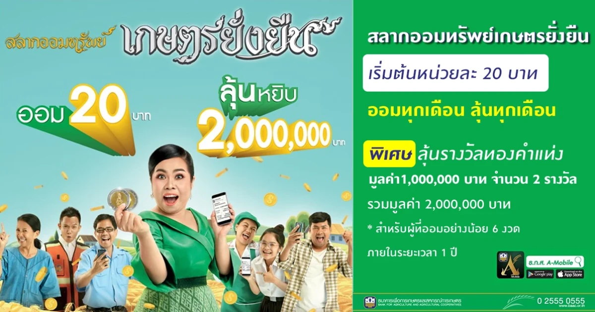 สลากออมทรัพย์เกษตรยั่งยืน จาก ธ.ก.ส. "ออม 20 ลุ้นหยิบ 2,000,000 บาท" เริ่มออมได้ตั้งแต่ 18 ส.ค.62
