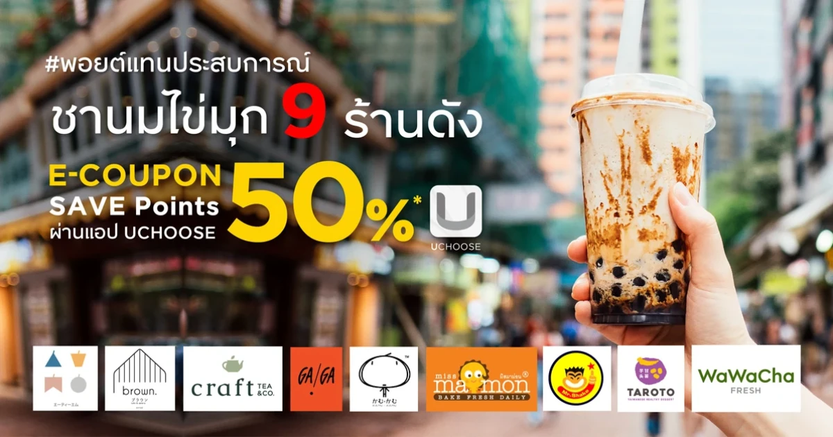 พอยต์แทนประสบการณ์ ลูกค้าบัตรเครดิต กรุงศรี Save Point 50% แลกรับ E-Coupon ส่วนลด 50 บาท ผ่านแอปฯ UChoose กับ 9 ร้านชานมไข่มุก ร้านดัง ATM Tea Bar, Craft Tea & Co, Brown Cafe', Ga Ga, KAMU, Miss Mamon, Mr. Shake, Taroto, Wawa Cha