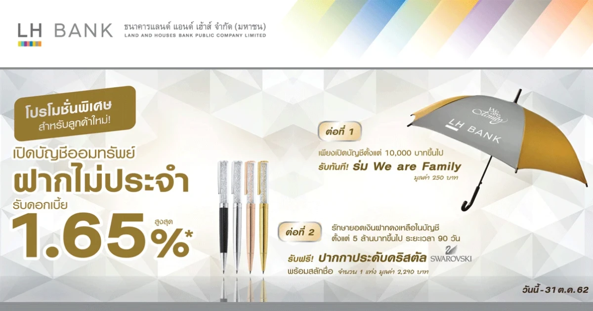 โปรโมชั่นพิเศษสำหรับลูกค้าใหม่ที่เปิด บัญชีเงินฝากไม่ประจำ LH Bank รับดอกเบี้ยสูงสุด 1.65% ต่อปี ให้อิสระเบิกถอน...รับดอกเบี้ยที่สูงกว่า