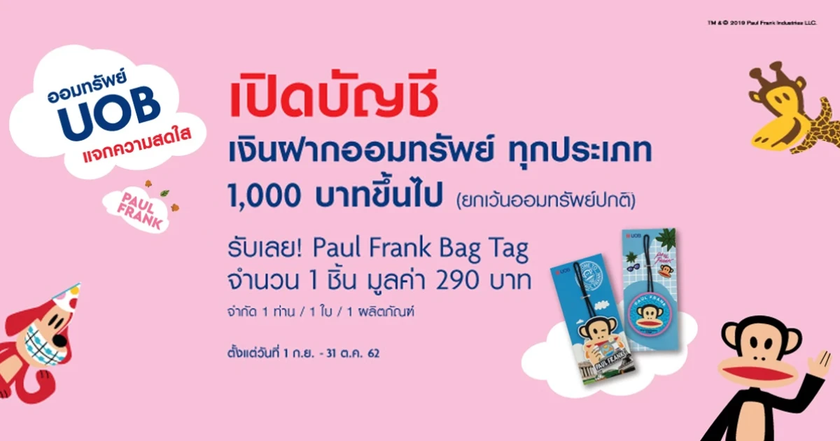เปิดบัญชีเงินฝากออมทรัพย์กับยูโอบี 1,000 บาทขึ้นไป รับเลย! Paul Frank Bag Tag 1 ชิ้น มูลค่า 290 บาท