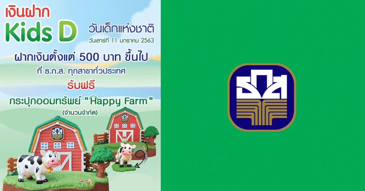 "เงินฝาก Kids D" สำหรับลูกค้า ธ.ก.ส. ที่เปิดบัญชีใหม่ หรือฝากเงินเพิ่มใน บัญชีเงินฝากออมทรัพย์บัญชีเงินฝากออมทรัพย์ทวีโชค และ บัญชีเงินฝากออมทรัพย์ A-Savings, บัญชีเงินฝากรักษาทรัพย์ ตั้งแต่ 500 บาทขึ้นไป ในวันเด็กแห่งชาติ (วันเสาร์ที่ 11 มกราคม 2563) รับฟรี!! กระปุกออมทรัพย์ "Happy Farm" จาก ธ.ก.ส.