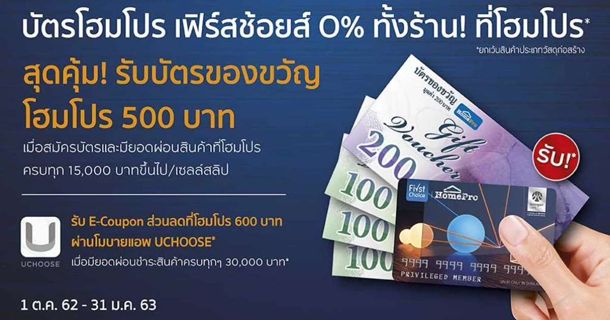 - สำหรับลูกค้าที่สมัครบัตรโฮมโปร เฟิร์สช้อยส์ ที่เป็นบัตรใหม่เฉพาะบัตรหลักที่ได้รับอนุมัติ ตั้งแต่วันที่ 1 ตุลาคม 2562 - 31 มกราคม 2563 และมียอดผ่อนสินค้าตั้งแต่ 15,000 บาทขึ้นไป / ใบเสร็จ ณ โฮมโปร ทุกสาขา ภายใน 45 วัน นับจากวันอนุมัติ (ไม่รวมการกดเงินสด) รับ บัตรของขวัญ โฮมโปร มูลค่า 500 บาท